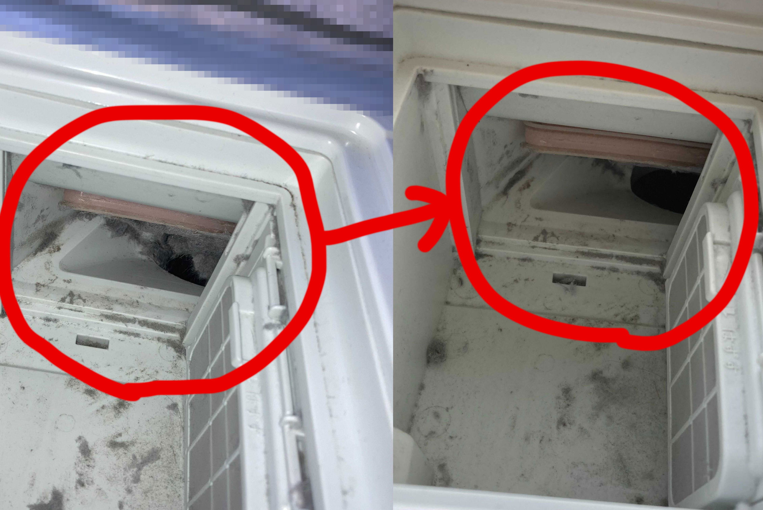 フィルターそのものもそうなのですが、その奥。名前がわからず、説明書で調べました。その名は「エコフラップ」。そこに。とてつもない量のほこりが詰まっていたんです。フィルター設置箇所の奥が開いてたのも初めて見たし、そのなかがこうなってるのもビックリしました。