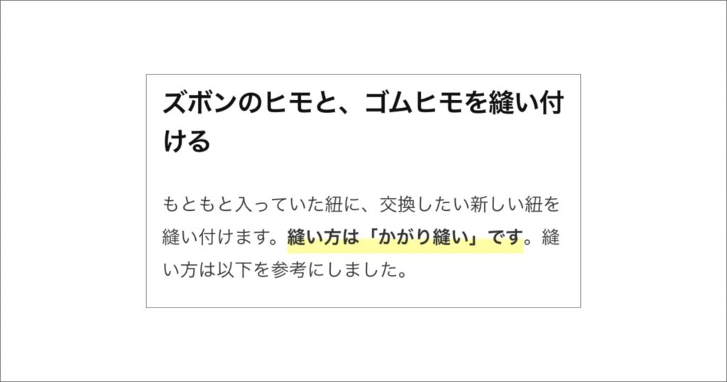 いろんなブログで実践されていて、よいアイディアだと思って取り入れました。これも私自身でcssを書き、ブログ投稿時のエディター(グーテンベルク)でclassを割り当てたうえで文字の強調をするとマーカーが表示されるようにしました。